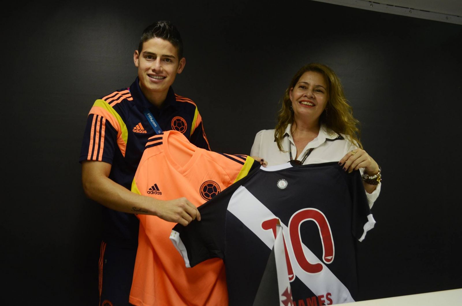 Primeira a treinar na parte da tarde, a seleção colombiana foi representada por seu camisa 10, James Rodríguez, meia que atua pelo Mônaco (FRA). Um dos destaques da equipe na Copa, Rodríguez, de apenas 22 anos, recebeu a camisa do Vasco das mãos da coordenadora do Departamento Social e Eventos (SoEve), Martha Tulio. Com sorriso no rosto, o jogador também presenteou o Vasco com uma camisa da seleção colombiana.