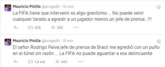 - O senhor Rodrigo Paiva, chefe de imprensa do Brasil, me agrediu com o punho no túnel sem razão. A Fifa não pode suportar esse delinquente. A Fifa tem que intervir, isso é algo gravíssimo. Um idiota qualquer não pode vir e agredir um jogador, muito menos um chefe de imprensa - esbravejou o jogador, que completou logo depois: