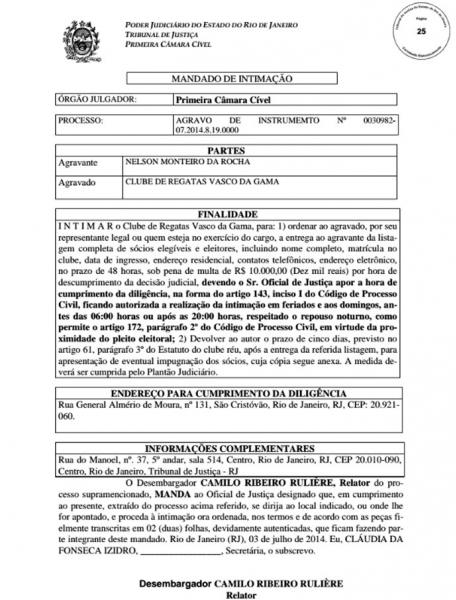 O desembargador Camilo Ribeiro Rulièri, da 1ª Câmara Cível do Tribunal de Justiça do Estado do Rio de Janeiro, concedeu uma liminar entregue ao grupo ‘Vira Vasco’, que tem como candidato a presidência Nelson Rocha, determinando ao clube que conceda uma lista com nomes de sócios eleitores e elegíveis. O clube será intimado e terá 48 horas para fornecer essa listagem.