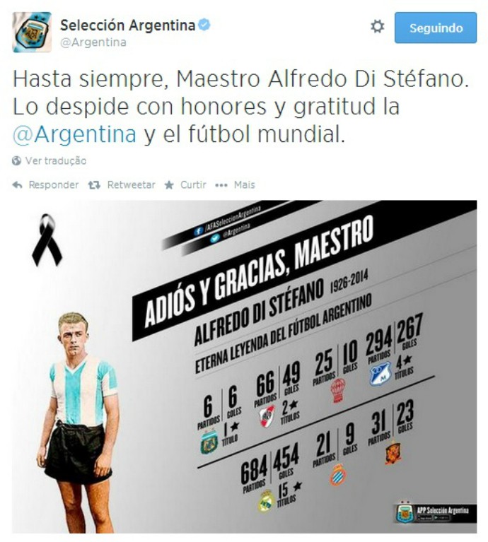 Aos 88 anos, Don Alfredo, como é conhecido pelos madridistas, morreu e deixou um legado colossal no estádio Santiago Bernabéu, que por acaso leva o nome do homem que fez possível a sua chegada ao Real. Não haveria "La Décima" sem o argentino, não haveria a 'síndrome' de lutar pelo título todos os anos, não fosse a "Saeta rubia", ou flecha loira, em espanhol.