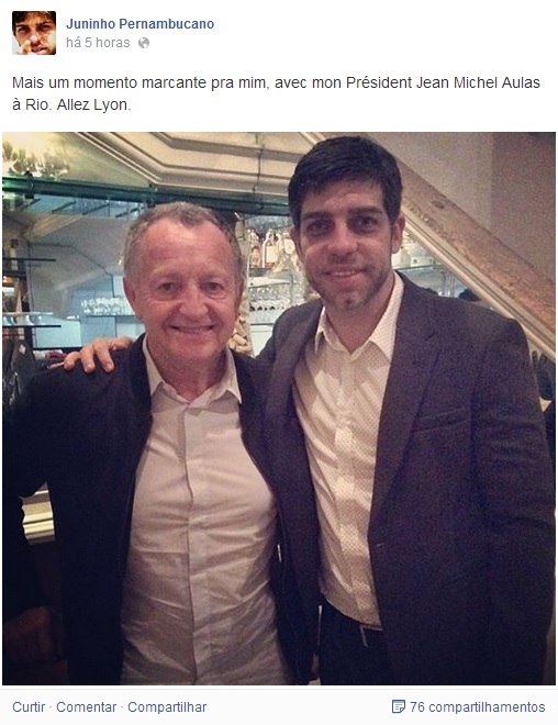 Juninho posta foto com Jean Michel Aulas, mandatário do Lyon, e escreve: 'Meu presidente'