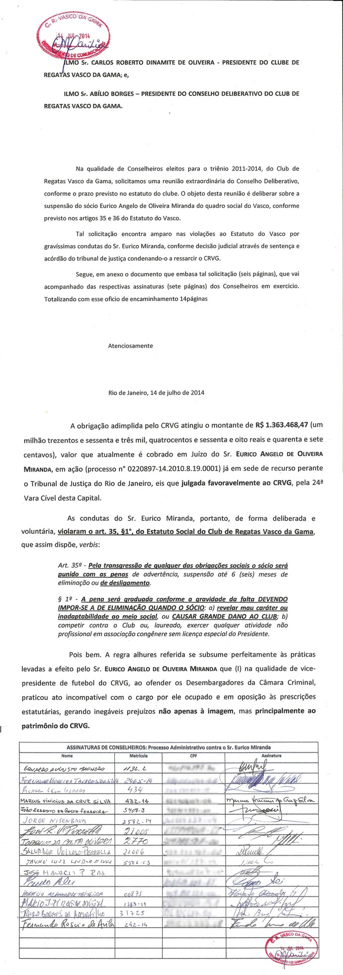 O artigo 76 do estatuto do Vasco diz que o Conselho Deliberativo deve se reunir, extraordinariamente, no caso de solicitação de 1/4 dos conselheiros - ou seja, mínimo de 75 assinaturas. O grupo pretende levar à votação a suspensão de Eurico do quadro social por seis meses, o que poderia inviabilizar sua candidatura, pois os elegíveis na eleição do clube devem ter cinco anos ininterruptos no quadro associativo do Vasco. O ex-presidente contesta a iniciativa de seus adversários e até a validade das assinaturas do documento. Eurico diz que já tomou conhecimento de que, pelo menos, duas pessoas vão retirar seus nomes da lista. O que deixaria apertada a conta para exigência de convocação de reunião extraordinária.