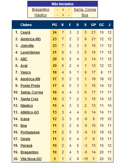 Após o empate contra o América-RN (1 a 1), o Vasco segue na 7ª colocação do Brasileiro da Série B, mas pode perder até 2 posições antes do fim da 12ª rodada. Isso acontecerá se Sampaio Corrêa e Náutico vencerem suas partidas, marcadas para as 21h.