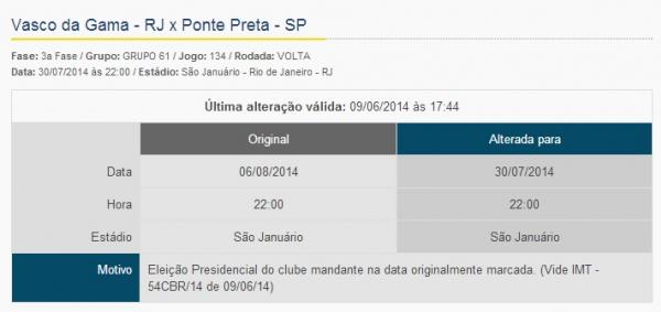 Vasco x Ponte Preta pela Copa do Brasil foi antecipado de 06/08 pára 30/07 devido às eleições vascaínas