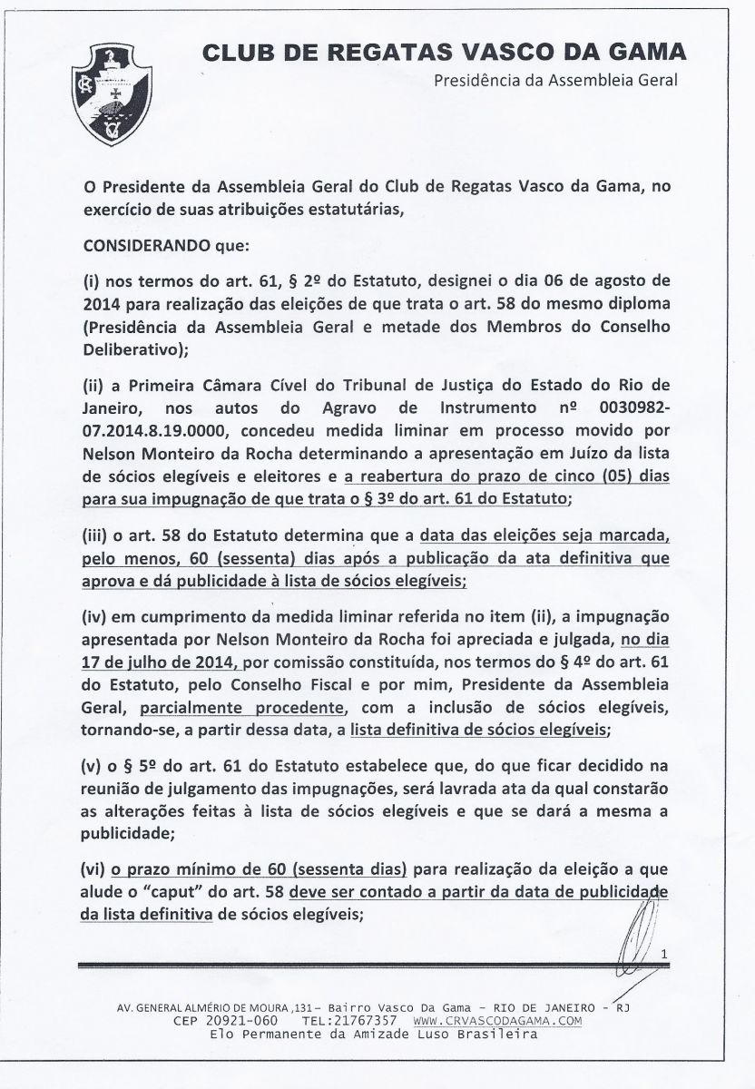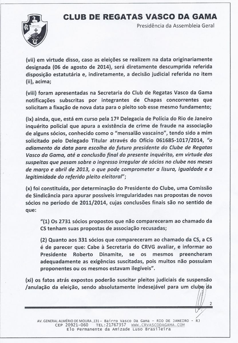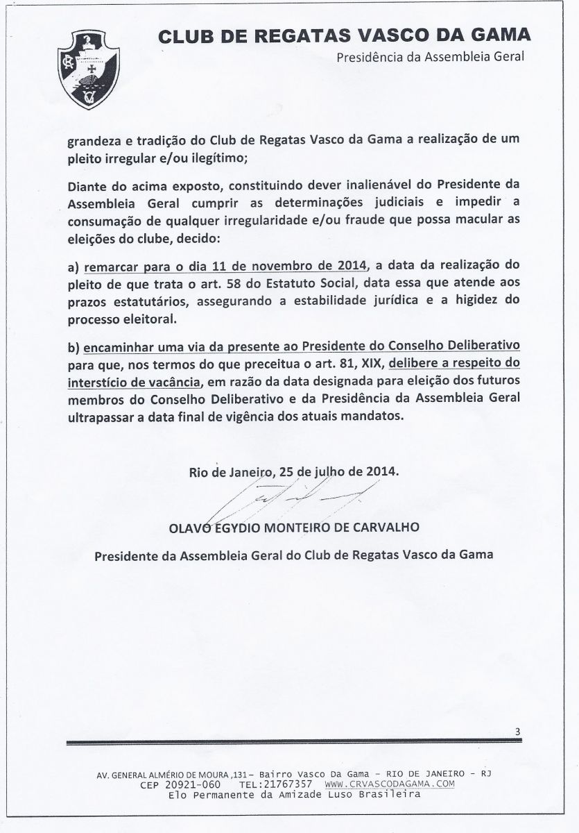 O Presidente da Assembléia da Geral do Club de Regatas Vasco da Gama decidiu pelo adiamento das eleições presidenciais para o dia 11 de novembro de 2014. Confira abaixo a íntegra da decisão.