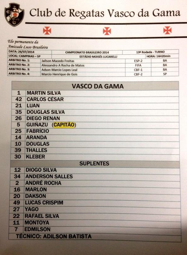 Confira a escalação oficial do Vasco para o jogo contra a Ponte Preta