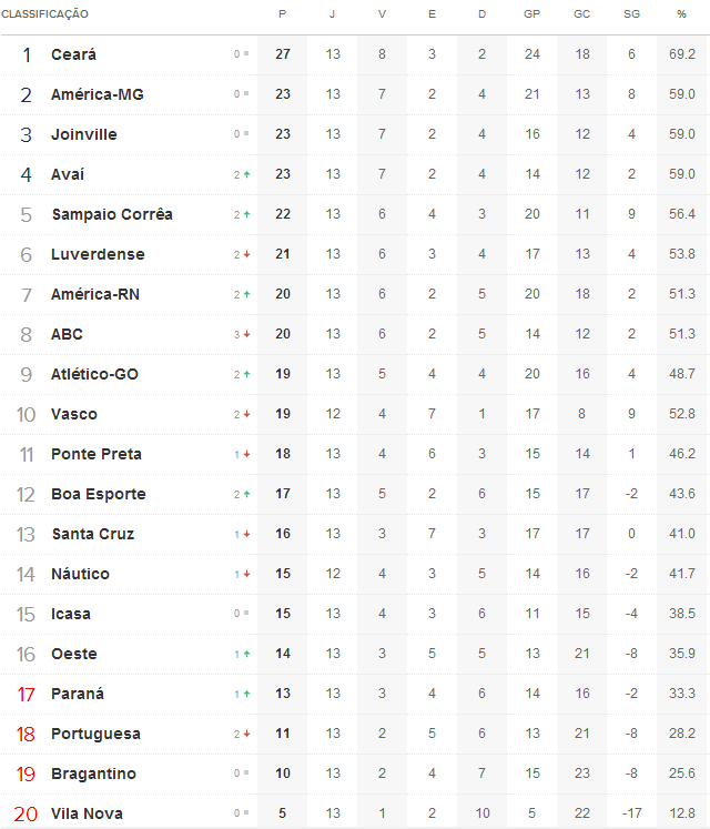 Terminada a 13ª rodada do Campeonato Brasileiro da Série B, o Vasco, que empatou com a Ponte Preta por 0 a 0, caiu da 8ª para a 10ª colocação na classificação. O Vasco está 4 pontos abaixo do G4 e 6 acima da zona do rebaixamento.