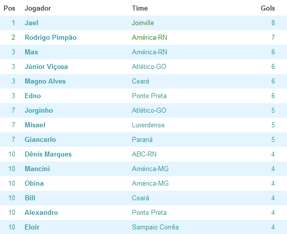 Com 2 gols marcados, Douglas, Marlon e Fabrício estão na 33ª colocação na artilharia ao lado de vários outros jogadores. O goleador da competição é Jael, do Joinville, com 8 gols.