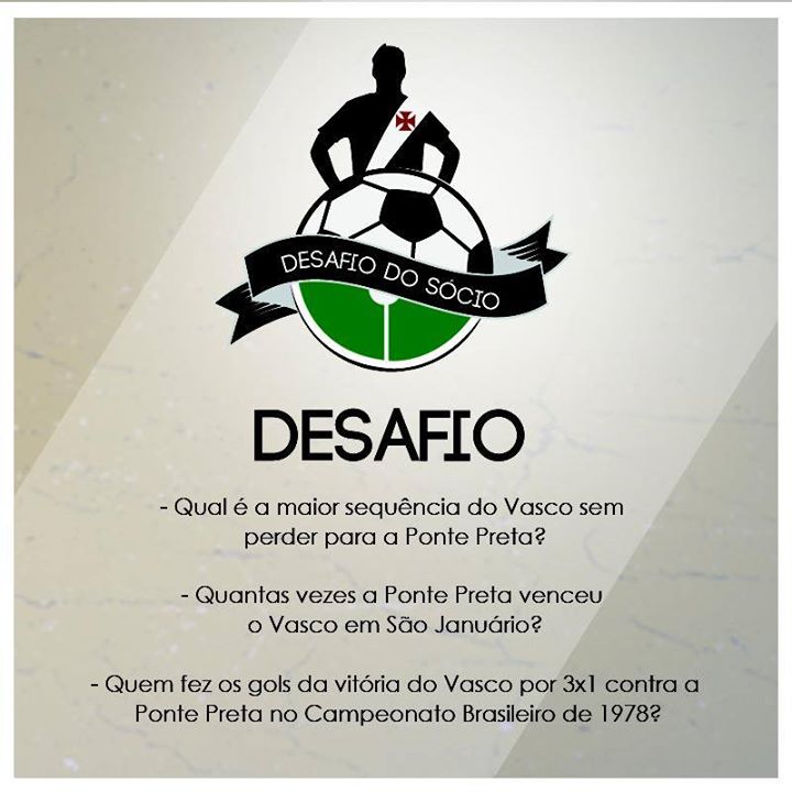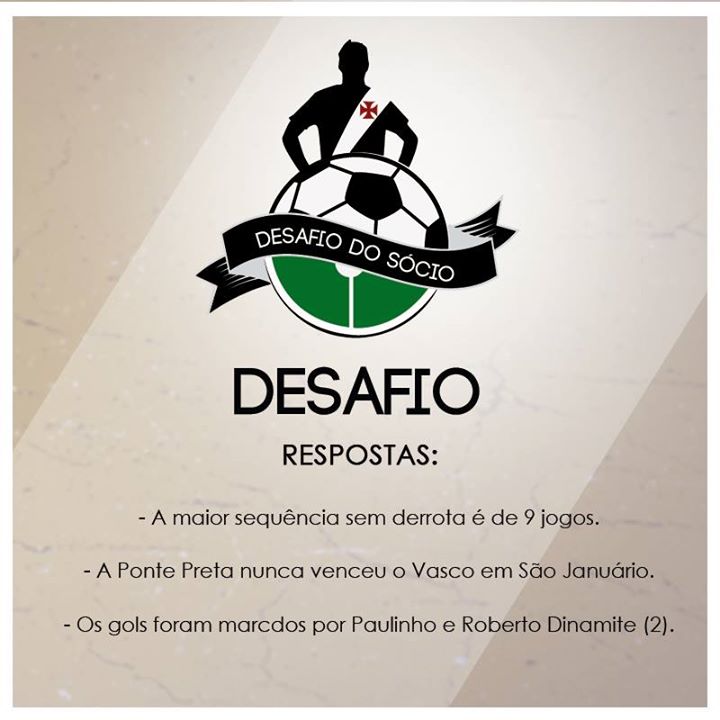 Os sócios CARLOS EDUARDO LAMBERT, FILIPE RODRIGUES ROSADO, RAFAEL DE SOUZA RODRIGUES, LUCAS ALTINO SOARES e MARCELO RODRIGUES DE FREITAS foram os primeiros a responder corretamente, ganharam um par de ingressos (social) para o jogo contra a Ponte Preta e viverão a incrível experiência de participar de um desafio no gramado de São Januário, valendo uma camisa oficial na hora!