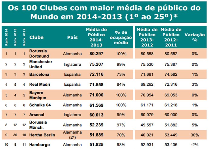 O ranking é dominado pelo continente europeu, que tem 78 dos 100 clubes com maior média de público do mundo na última temporada. Os 13 primeiros também são do Velho Continente. Em comparação ao mesmo estudo realizado no ano passado, as três primeiras posições seguem inalteradas. O Borussia Dortmund lidera, seguido de Manchester United (75,2 mil/jogo – 99% de ocupação) e Barcelona , com (72,1 mil/jogo). O clube catalão, no entanto, teve "apenas" 73% de ocupação do Camp Nou.
