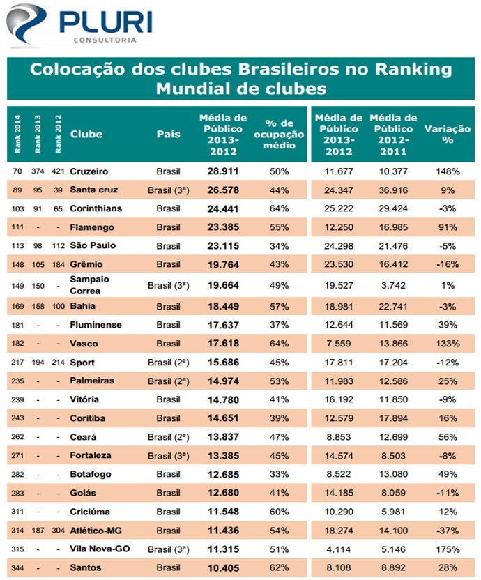 O Brasil tem apenas dois clubes na lista dos 100. Atual campeão nacional e líder do Brasileirão 2014, o Cruzeiro aparece em 70º, com 28,9 mil torcedores por partida. Vencedor da Série C no ano passado, o Santa Cruz, da Segunda Divisão, ocupa a 89ª colocação, com 26,6 mil/jogo. Além de ser o único clube do país a aparecer nos três rankings realizados anteriormente pela "Pluri Consultoria", o Santa Cruz possuí a maior média de público do futebol brasileiro no acumulado dos últimos três anos: 29,3 mil/jogo.