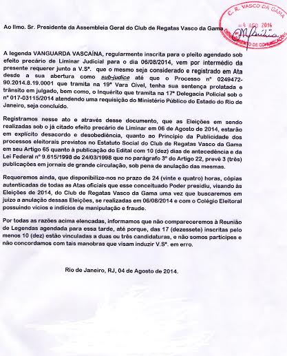 VANGUARDA VASCAÍNA PROTOCOLA PEDIDO AO PRESIDENTE DA ASSEMBLEIA GERAL, PEDINDO QUE DECLARE EM ATA NA ABERTURA DO PROCESSO CASO OCORRAM, AS ELEIÇÕES COMO SUB-JUDICE. SOLICITA CÓPIA DAS ATAS E LUTARÁ PELA ANULAÇÃO DO PLEITO POR IRREGULARIDADES ADMINISTRATIVAS (DESRESPEITO AO ESTATUTO DO CLUBE) E LEGAIS (DESRESPEITO À LEI 9.615/1998).