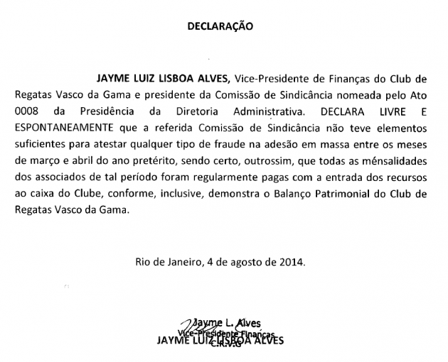 Declaração do Presidente da Comissão de Sindicância Jayme Lisboa Alves