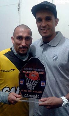 O capitão do time vascaíno de basquete, Ricardinho, posou com o El Cholo Guinãzu com o troféu do Torneio Carioca de Basquetebol.