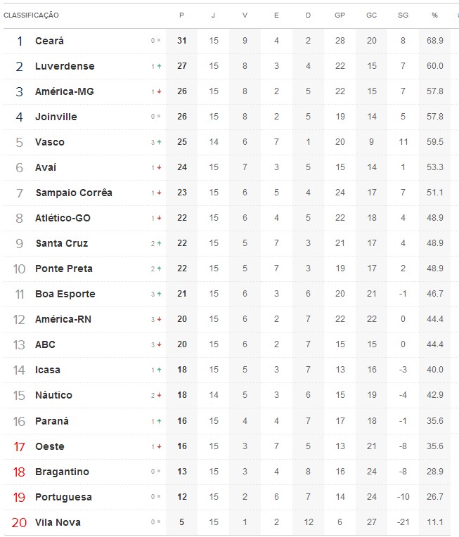 Terminada a 15ª rodada do Campeonato Brasileiro da Série B, o Vasco, que derrotou o ABC por 2 a 1, subiu da 8ª para a 5ª colocação na classificação. O Vasco está 1 ponto abaixo do G4 e 9 acima da zona do rebaixamento.