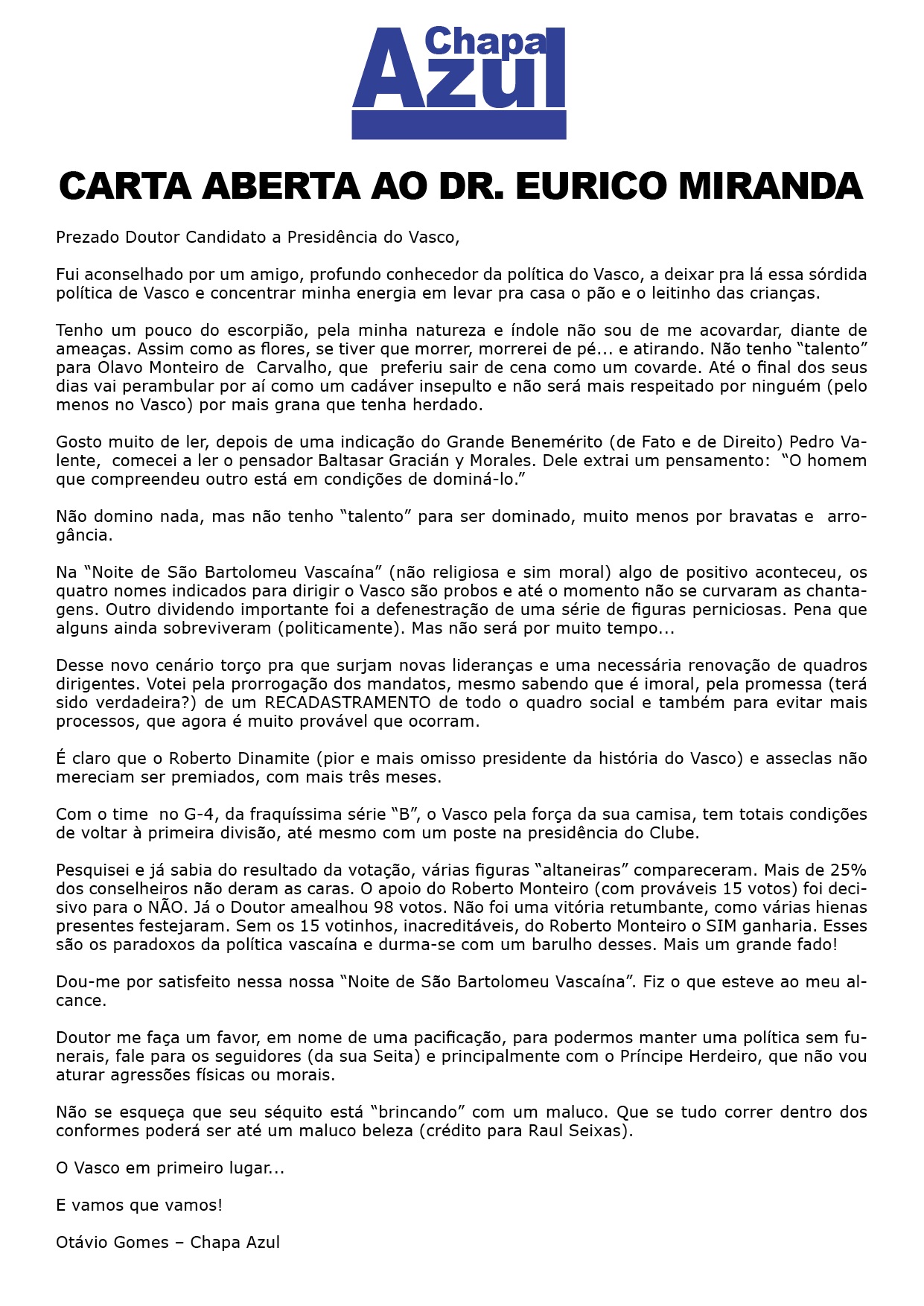 Otávio Gomes, da Chapa Azul, divulga carta aberta para Eurico Miranda