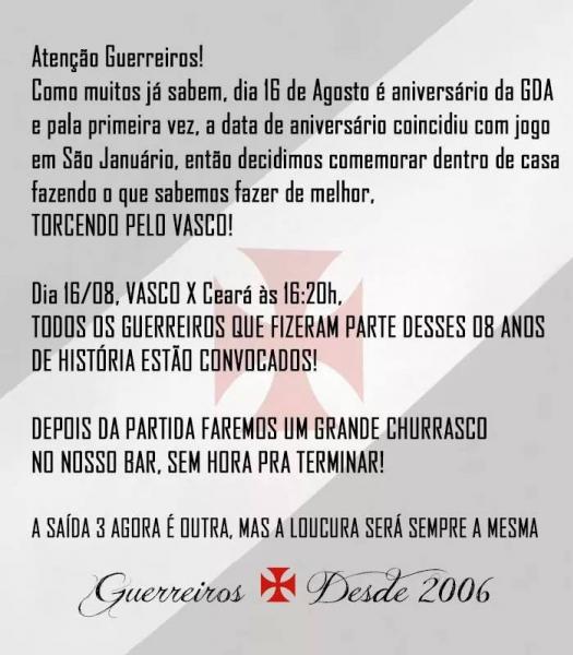Dia 16 é um grande dia pra nossa torcida, venha comemorar com a gente, vamos lotar nosso templo e apoiar o Vasco nessa campanha! Sempre ao seu lado até o fim.