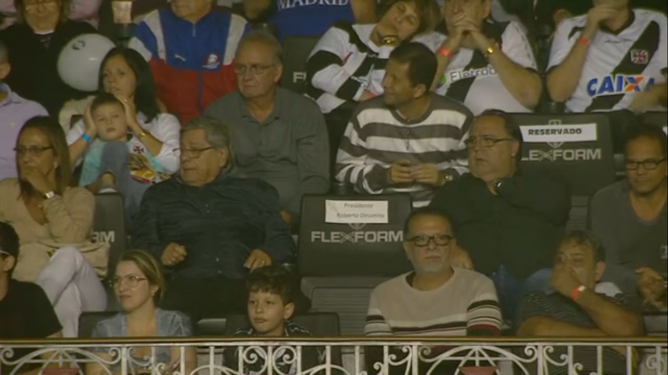 Durante a transmissão de Vasco x Ceará, o canal Premiere flagrou o assento reservado de Roberto Dinamite vazio na tribuna de honra. Clique aqui e veja o vídeo do momento. Apesar de não estar na tribuna, Dinamite esteve em São Januário apresentando o novo reforço Maxi Rodriguez.