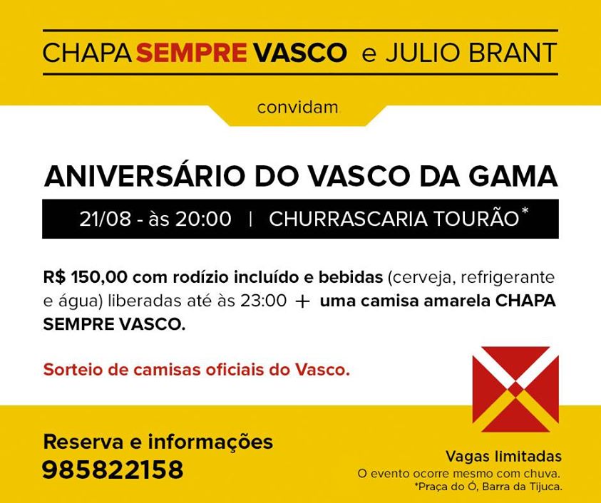 Chapa Sempre Vasco, de Julio Brant, convida para jantar de aniversário do Vasco