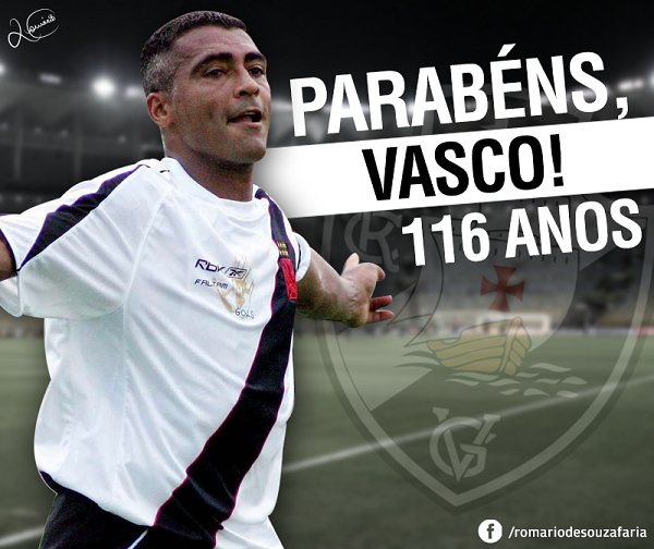 Hoje é aniversário do Club de Regatas Vasco da Gama. Parabéns por todas as glórias, conquistas e vitórias nesses 116 anos. Jamais deixaria de parabenizar o Clube onde conquistei um dos maiores feitos da minha carreira, meu milésimo gol! Me sinto honrado de ter vestido também essa camisa e participado dessa história!