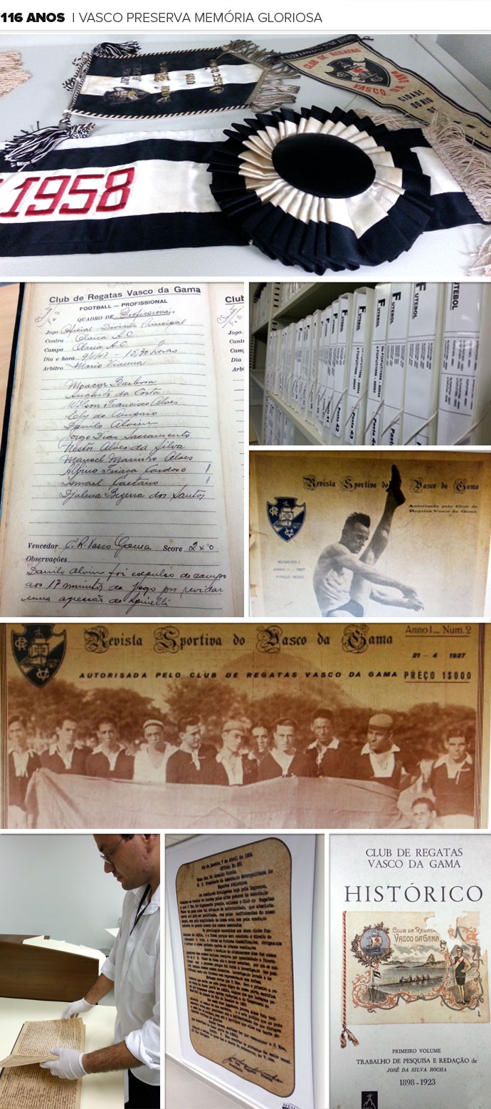 No ambiente de dois escritórios, salão de reunião e outro que abriga um historiador do clube - e em breve vai servir para pesquisas do público em geral -, o Vasco tem um espaço condicionado para guardar sob condições rígidas de temperatura - para conservar os antigos papéis - raridades de 50, 60, 70, 100 anos atrás. O livro do ex-presidente José da Silva Rocha em comemoração aos primeiros 25 anos do Club de Regatas Vasco da Gama, a badalada “Resposta Histórica” contra o racismo com o pedido de exclusão de 12 jogadores vascaínos em reprodução que cobre uma parede do espaço, fotos do lançamento da pedra fundamental do estádio, revista comemorativa do sul-americano que o Expresso da Vitória conquistou em 1948 no Chile, além de súmulas de jogos com curiosidades como a do dia em que o príncipe Danilo Alvim deixou a classe de lado e foi expulso ao agredir um jogador do Olaria nos anos 1940.