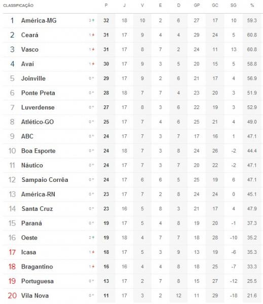 A briga pela liderança do Campeonato Brasileiro da Série B não está restrita a Vasco e Ceará. O América-MG venceu a Ponte Preta por 3 a 0 e chegou à liderança da tabela com 32 pontos. Para 'dormir' na 1ª colocação nesta sexta-feira, o Vasco precisa vencer o Icasa. O Ceará joga no sábado contra a Portuguesa no Canindé.