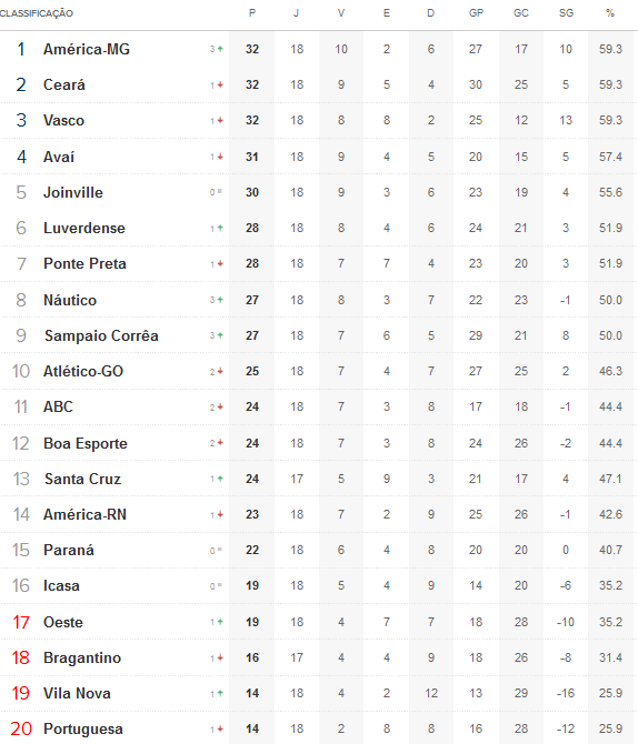 Terminada a 18ª rodada do Campeonato Brasileiro da Série B, o Vasco, que empatou com o Icasa por 1 a 1, caiu para o 3º lugar na classificação. O Vasco está com o mesmo número de pontos do líder América-MG e do segundo colocado Ceará (32 pontos), mas tem menos vitórias.
