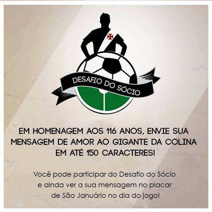 Em homenagem aos 116 anos, o Club de Regatas Vasco da Gama fará uma promovação para o jogo da próxima terça-feira (26/08). Os interessados precisam enviar uma mensagem de amor ao Gigante da Colina em até 150 caracteres! Os cinco SÓCIOS que enviarem as melhores mensagens participarão do DESAFIO DO SÓCIO no gramado de São Januário no intervalo da partida cotra o ABC e concorrerão a uma camisa!