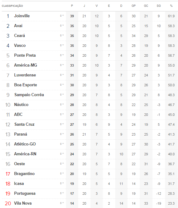 Na abertura da 21ª rodada do Brasileiro da Série B, o líder Joinville recebeu o Paraná na noite desta 2ª-feira (08/09) e venceu por 3 a 0, chegando aos 39 pontos e abrindo 4 em relação ao Vasco, que, mesmo que vença o Luverdense nesta 3ª-feira (09/09) e Avaí (2º colocado) e Ceará (3º) tropecem, não terminará a rodada no topo da tabela.