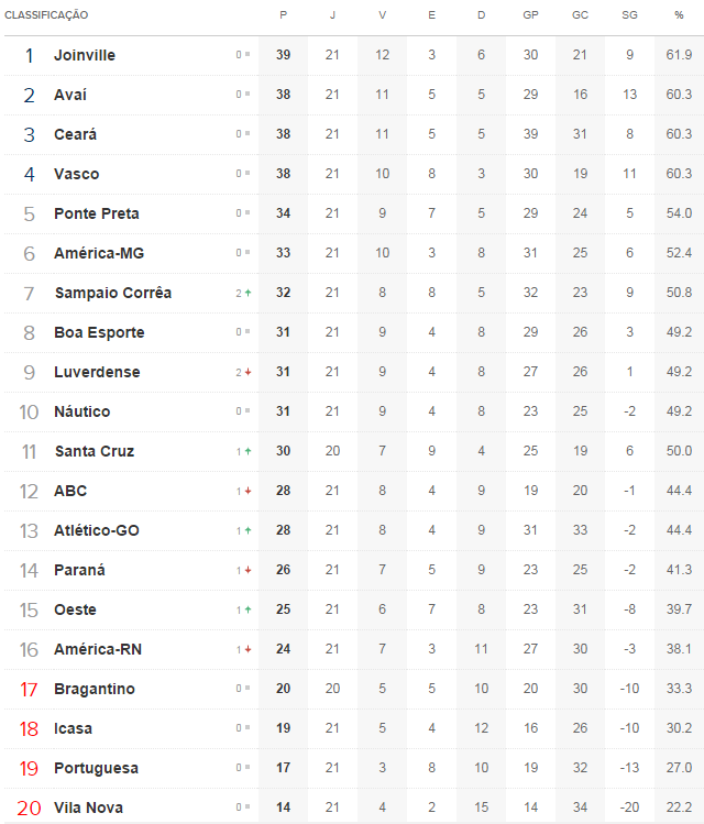 Terminada a 21ª rodada do Campeonato Brasileiro da Série B, a 2ª do returno, o Vasco, que venceu o Luverdense por 2 a 0, manteve-se em 4º lugar na classificação e 1 ponto atrás do líder Joinville. A distância do Gigante da Colina para o 5º colocado, no entanto, aumentou de 1 para 4 pontos.