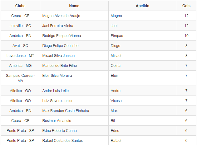 Com 4 gols marcados, Douglas e Rodrigo são os artilheiros do Vasco na Série B. Os goleadores máximos da competição são Magno Alves, do Ceará, e Jael, do Joinville, com 12 gols.