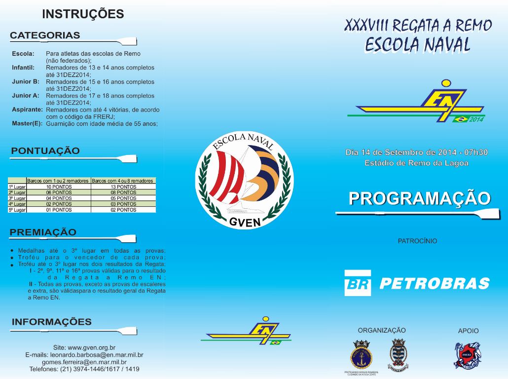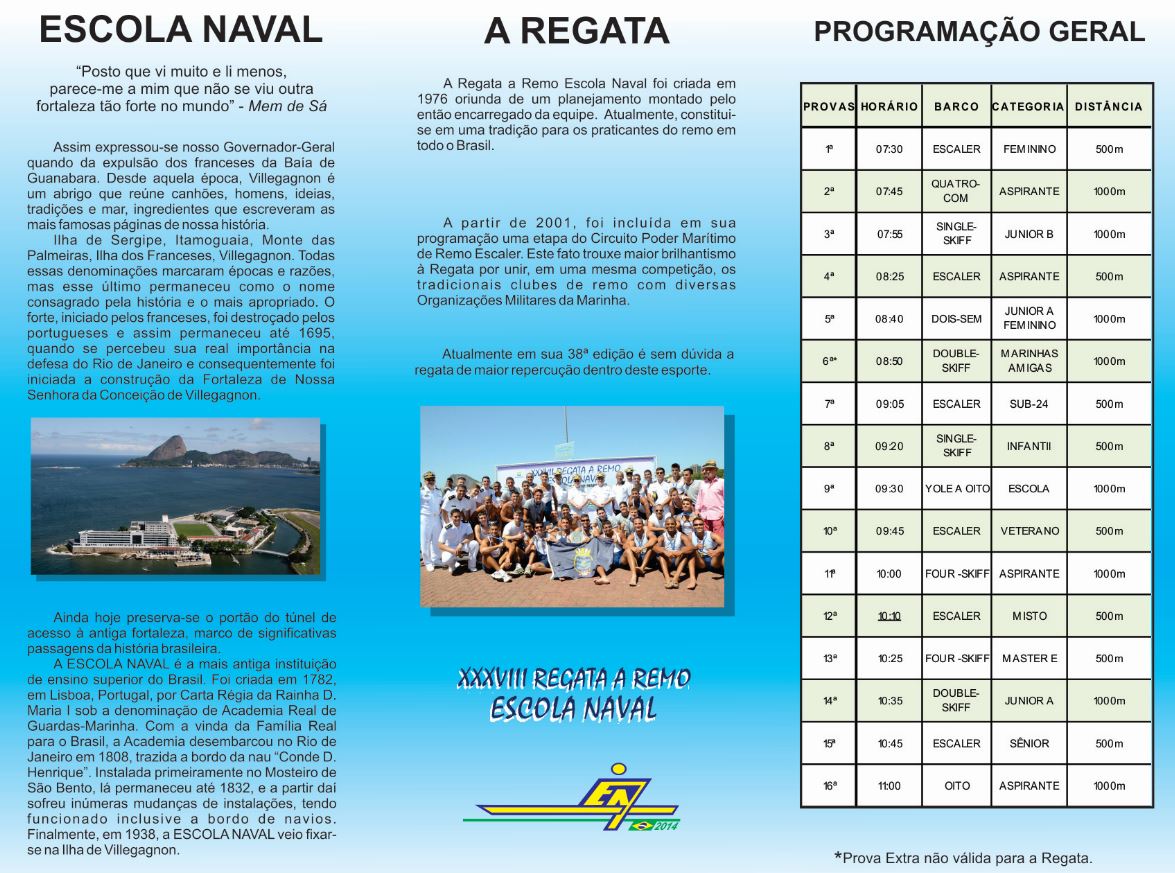 No próximo dia 14 de setembro, a Lagoa Rodrigo de Freitas será cenário da 38ª Regata a Remo Escola Naval, considerada a maior competição da modalidade no Rio de Janeiro. A regata tem entrada gratuita e contará com exposição de artigos militares e recreação infantil.