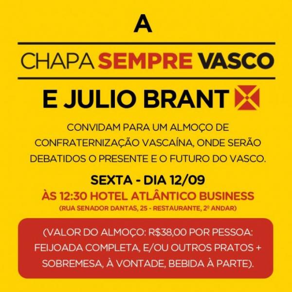 Vascaíno, contamos com a sua presença no almoço de confraternização nesta sexta-feira (12/09) para debatermos o presente e o futuro do Vasco! #SempreVasco #JulioPresidente