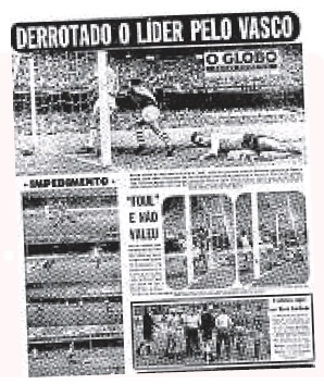 Futebol — Um goal aos 20 minutos do primeiro tempo, de Célio, deu ao Vasco a grande vitória sobre o Fluminense por 1 x 0, fazendo o tricolor dividir agora com o América a liderança do campeonato.
