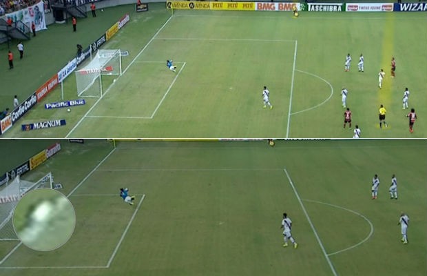 A imagem aproximada mostra que a arbitragem se equivocou. Para o comentarista Carlos Eduardo Lino, Paulo Henrique Vollkopf só confirmou o gol ao ver que o assistente correu em direção do centro do gramado.