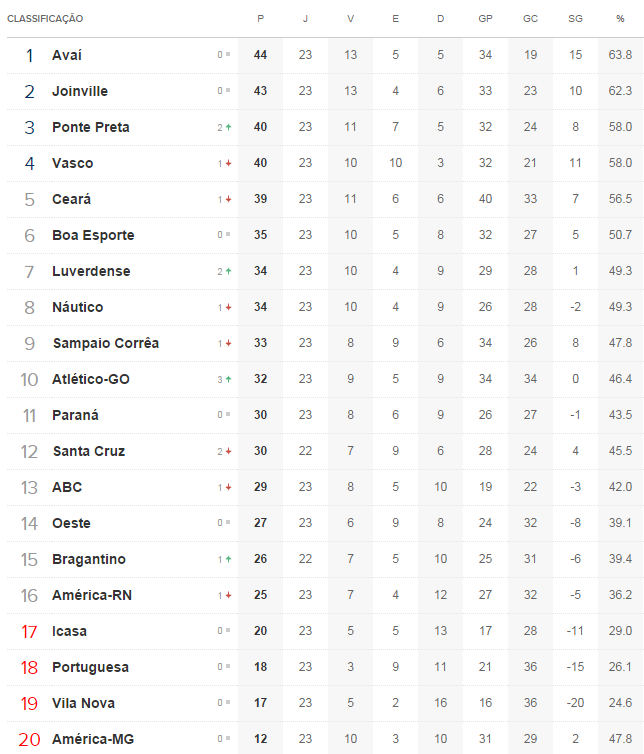 Terminada a 23ª rodada do Campeonato Brasileiro da Série B, a 4ª do returno, o Vasco, que empatou com o Oeste por 1 a 1, caiu do 3º para o 4º lugar na classificação e está 4 pontos atrás do líder Avaí. A diferença do Gigante da Colina para o 5º colocado (Ceará) caiu de 2 pontos para 1 ponto.