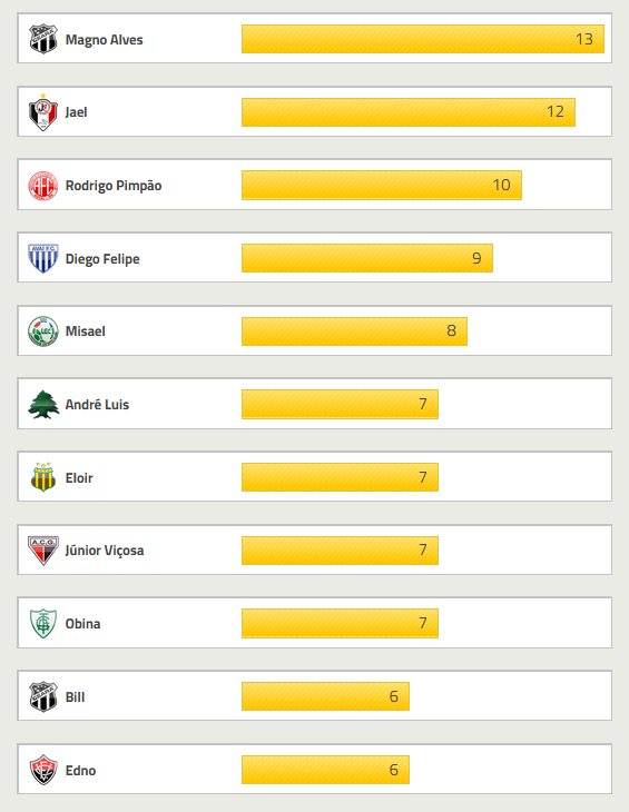 Com 5 gols marcados, Douglas é os artilheiro do Vasco na Série B. O goleador máximo da competição é Magno Alves, do Ceará, com 13 gols.