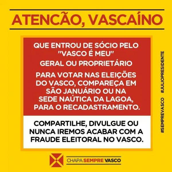 Chapa Sempre Vasco, do candidato Julio Brant, faz apelo para que sócios se recadastrem