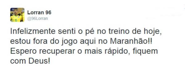 No último treino antes do jogo contra o Sampaio Corrêa, o técnico Joel Santana ganhou mais um problema. O lateral-esquerdo Lorran machucou o pé na atividade realizada nesta segunda-feira, no estádio Castelão, em São Luís, e está fora da partida. Marlon, lateral-esquerdo reserva, deve ser o escolhido para iniciar o jogo. O anúncio da lesão e do desfalque foi feito pelo próprio jogador, através de seu Twitter.
