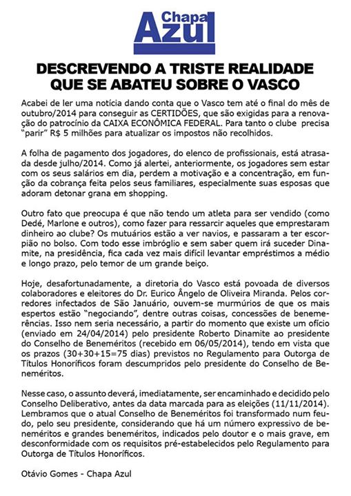 Chapa Azul publica nota sobre a situação financeira e política do Vasco