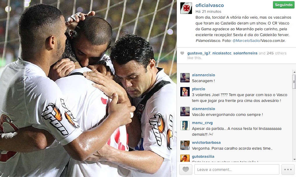 Via Instagram, Vasco agradece torcida do Maranhão pelo carinho