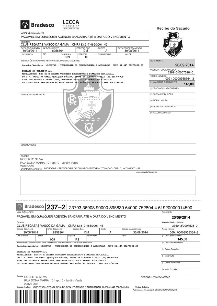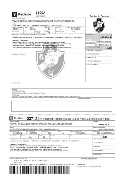 A partir deste mês, os boletos de pagamento das inscrições e mensalidades do Programa de Sócios passam a ser emitidos pela Financeira Lecca e agora são personalizados com o escudo do Vasco, conforme representação abaixo.