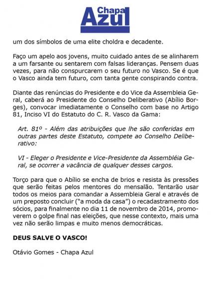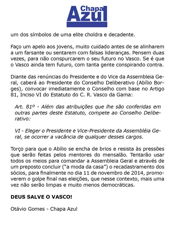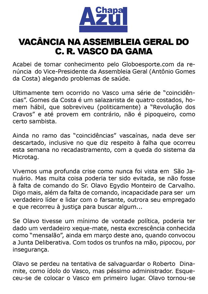 Chapa Azul divulga nota sobre vacância na Assembleia Geral do Vasco