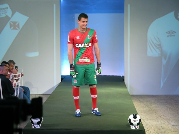 Goleiro Rafael Copetti apresenta uniforme de goleiro em homenagem a Portugal.