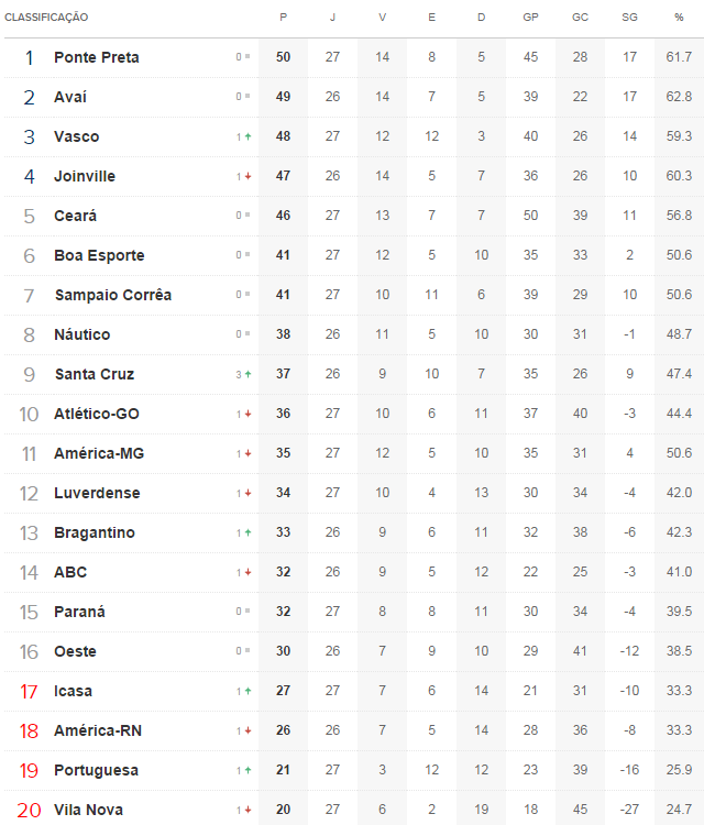 O empate por 2 a 2 contra o Bragantino não tirou o Vasco do G4. O Gigante da Colina está em 3º lugar na tabela e pode terminar a 27ª rodada nessa colocação, mas, para que isso ocorra, o Joinville precisa perder para o América-RN.