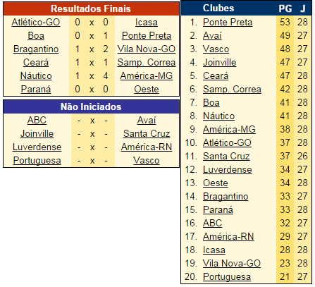 Nos jogos das 19h30 desta 3ª-feira (07/10), a Ponte Preta venceu o Boa por 1 a 0 e garantiu a liderança isolada do Brasileiro da Série B por mais uma rodada. Já o Ceará empatou com o Sampaio Corrêa por 1 a 1 e permaneceu atrás do Vasco, que seguirá no G4 qualquer que seja o resultado de sua partida diante da Portuguesa.