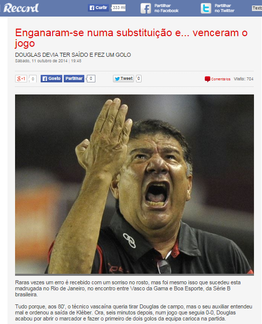 O jornal português Record repercutiu o curioso caso ocorrido no jogo Vasco 2 x 0 Boa, em que Douglas deveria ter sido substituído, não foi e acabou fazendo o gol que abriu o caminho para a vitória vascaína.