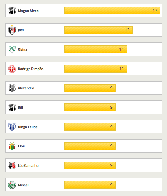 Com 8 gols marcados, Douglas é o artilheiro do Vasco na Série B. O goleador máximo da competição é Magno Alves, do Ceará, com 17 gols.