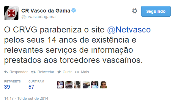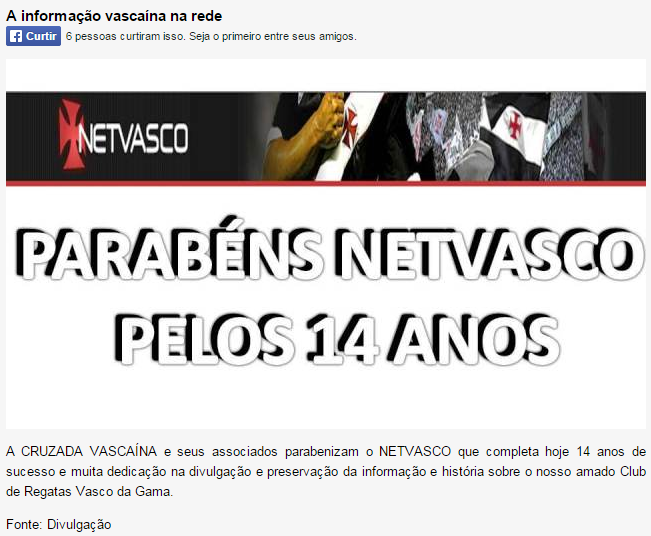 Vasco e Cruzada Vascaína parabenizaram a NETVASCO pelos 14 anos do site
