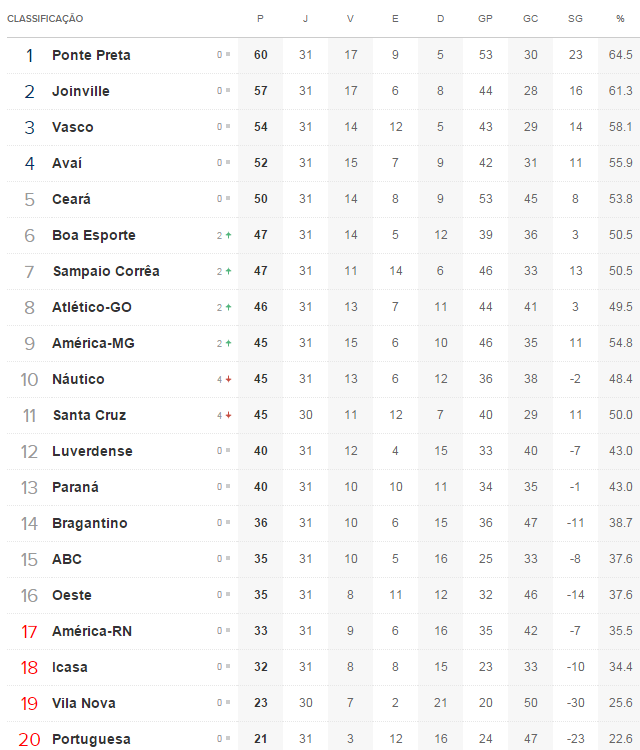 Praticamente terminada a 31ª rodada do Campeonato Brasileiro da Série B (o jogo Santa Cruz x Vila Nova será no dia 28/10), a 12ª do returno, o Vasco, que perdeu para o América-RN por 2 a 0, manteve-se no 3º lugar na classificação, mas viu sua diferença de pontos para a líder Ponte Preta aumentar de 3 para 6. A diferença do Gigante da Colina para o 5º colocado (Ceará) segue em 4 pontos.